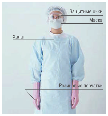 Перед подготовкой к дезинфекции / стерилизации рабочим раствором АСЕСАЙД наденьте средства индивидуальной защиты, например, защитные очки, перчатки из ПВХ или резиновые, защитную маску или респираторы универсального типа РПГ 67 или РУ 60М с патроном марки B, защитный халат.