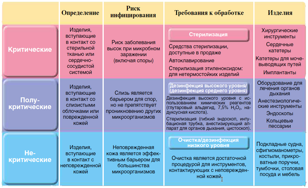 Классификация изделий медицинского назначения в зависимости от риска передачи инфекции (основано на классификации по Сполдингу)